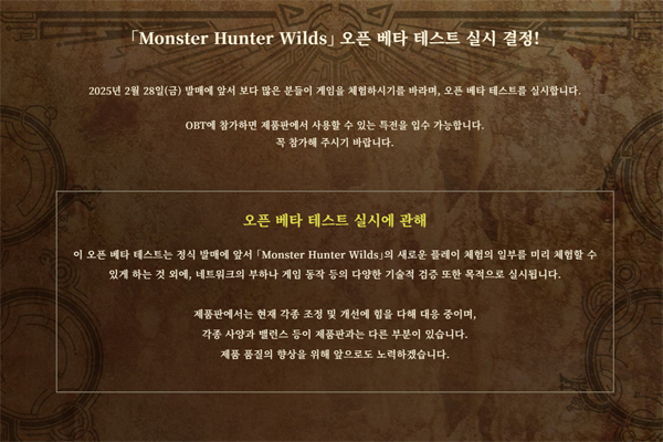 캡콤의 대표 게임 IP인 '몬스터 헌터' 시리즈의 최신작, '몬스터헌터 와일즈'가 오픈베타 테스트를 진행했다. 발매를 4개월 정도 앞두고, 모든 유저들에게 게임의 초기 부분을 선보이는 테스를 선보인 것이다. 베타 일정은 초기 플레이스테이션 유저 중심 테스트에 이어 후반 기간에 모든 플랫폼 유저들에게 개방됐다.