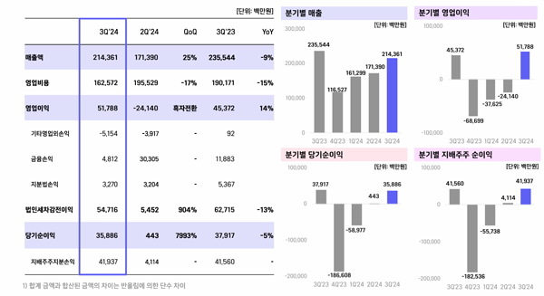 3분기 영업비용은 전분기 대비 17%, 전년동분기 대비 15% 감소한 1,625억원을 사용했다. 프로젝트 종료 등으로 인력 자연 감소하며 인건비가 줄어들었고, 효율적인 서버 운영과 서비스 재정비를 통하여 전분기 대비 서버비 포함 통신비에서 38% 감소 효과를 가져왔다.