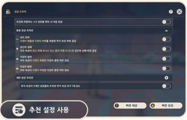 다음으로 성유물의 편의성이 개선된다. 간단한 조작만으로 성유물 일괄 관리를 할 수 있도록 개선이 이뤄지는 것이다. 추천 잠금 프리셋을 통해 별도 조작 없이 자동으로 조건에 맞는 성유물을 잠글 수 있다.