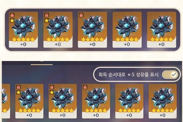 성유물의 별표 표시 기능도 추가된다. 중요한 성유물이 있으면 별표 표시를 할 수 있는데, 그러면 자동 잠금 처리가 되고 동일 조건일 때 빠르게 찾을 수 있도록 성유물 목록에서 우선 표시된다. 또 성유물 획득 페이지에 획득 순서대로 표시하는 기능도 추가된다.