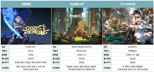 퍼블리싱 라인업으로는 모바일 방치형 RPG ‘갓앤데몬’, 크래프팅 MORPG ‘프로젝트M’, 트리플A급 멀티 플랫폼 MMORPG ‘더 스타라이트’, 에이버튼 등이 있으며, 모두 글로벌 시장에 선보일 예정이다. 여기에 더해 김대훤 대표가 이끄는 에이버튼의 MMORPG ‘프로젝트ES’와 브이에이게임즈의 육성 시뮬레이션 게임 ‘프로젝트 세이렌’도 향후 선보인다는 계획이다.