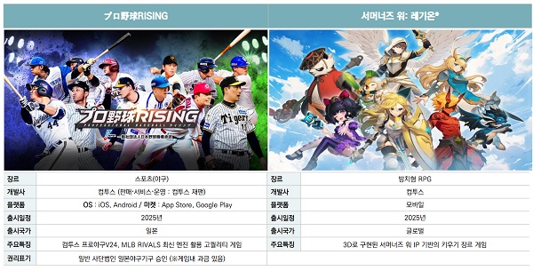2025년 선보일 신작 라인업도 공개했다. 자체 개발작으로는 일본 지역에 내년 1분기 출시 예정인 일본 프로야구 기반 모바일 게임 ‘프로야구라이징’과 ‘서머너즈워’ IP 기반의 모바일 방치형 RPG ‘서머너즈워:레기온’, 캐주얼 모바일 액션 게임 ‘레전드 서머너’ 등이 있다. 또한 최근 발표한 시프트업의 ‘데스티니 차일드’ IP 기반 방치형 RPG도 선보일 예정이다.