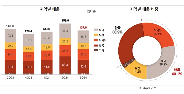 지역별 매출을 보면 해외가 전분기 대비 10.3%, 전년 동기 대비 5.9% 하락한 953억 원을 기록했다. 북미 지역이 388억 원을 기록해 28.2%를 차지하며 가장 높았고, 아시아 지역이 336억 원으로 24.4%를 차지했다. 국내는 전분기 대비 20.1% 감소, 전년 동기 대비 2.5% 증가한 426억 원으로 전체 매출 비중의 30.9%를 차지했다.