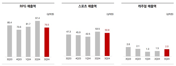 장르별 매출을 보면 RPG는 795억 원을 기록했는데, ‘서머너즈워’가 ‘주술회전’ IP 콜라보레이션 성과 등에 힘입은 것이다. 특히 올해 3개 분기 연속으로 전년 동기 대비 매출 성장을 기록했다.