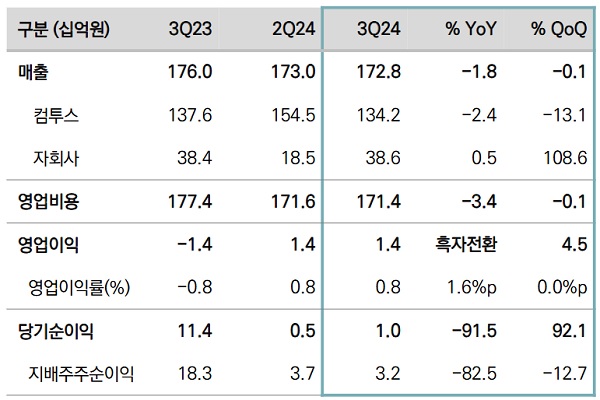 컴투스가 7일 발표한 2024년 연결기준 3분기 실적에 따르면, 매출 1,728억 원, 영업이익 14억 원, 당기이익 10억 원을 기록한 것으로 나타났다.