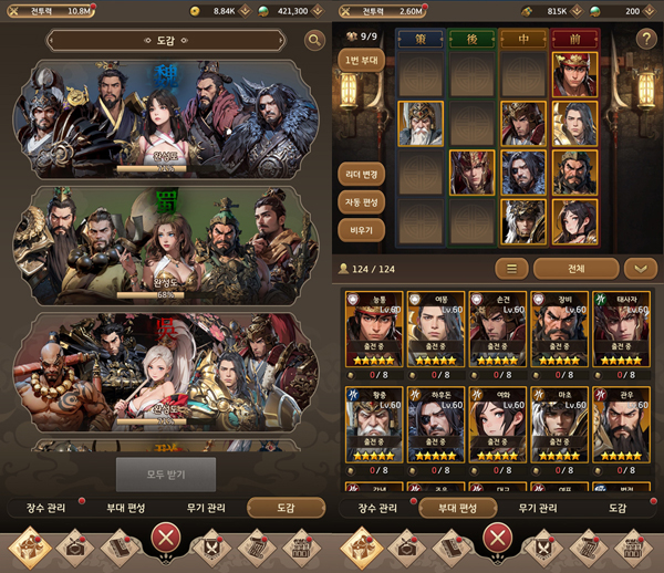 또한, 삼국지의 상징적인 장수들이 사용하는 병기도 성장의 한 축으로 제작됐다. 제갈량의 학우선, 관우의 청룡언월도, 여포의 방천화극 등 각 장수의 대표 무기를 수집해 장수를 더욱 강력하게 만들 수 있으며, 무기를 보유하기만 해도 모든 장수가 무기 강화 효과를 누릴 수 있어 전략적인 전투에서 큰 도움이 된다.