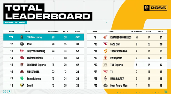 특히 TSM은 파이널 매치부터 달라진 경기력으로 최상위 자리를 차지했다. 매치3에서는 19킬 치킨을 가져가 한 경기에서 29점을 수급하는 등, 중위권과의 격차를 크게 벌렸다. 이어서 17게이밍과 케르베로스, 트위스티드 마인즈 등이 따라붙으면서 1위 경쟁을 지속했다.