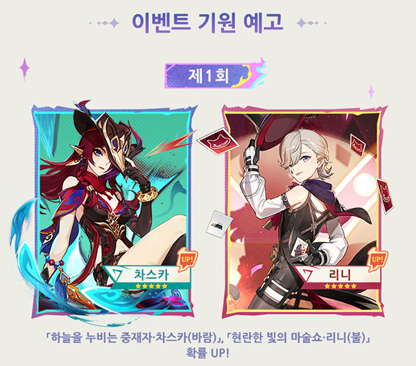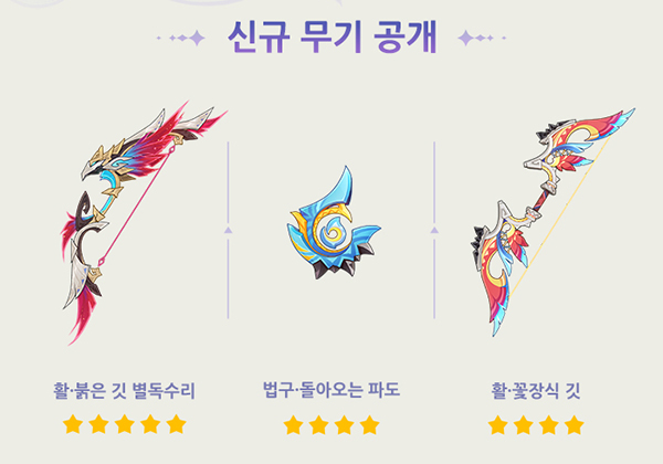 5.2 버전 상반기 이벤트 기원에서는 차스카와 리니가 확률 업으로 등장한다. 올로룬은 획득 확률이 대폭 증가한다. 하반기 이벤트 기원에서는 종려와 느비예트가 복각으로 찾아온다. 무기 이벤트 기원에서는 신규 5성 활, 붉은 깃 별독수리와 나타 신규 4성 무기, 꽃장식 깃(활)과 돌아오는 파도(법구)가 추가된다.