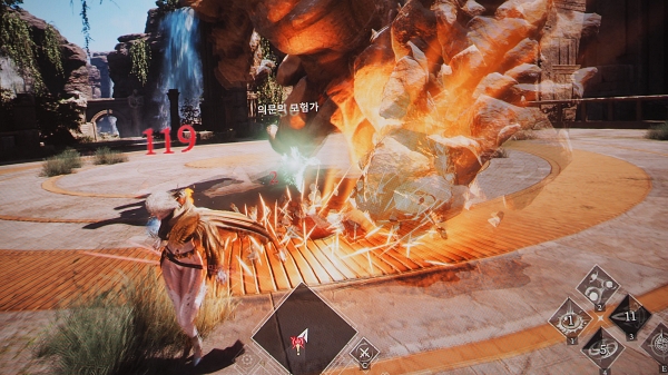 본격적인 전투는 논 타겟팅 액션으로 진행된다. W, A, S, D를 통한 이동과 기본적으로 4개의 스킬을 사용할 수 있다. 스킬 쿨타임 동안에는 일반 공격을 사용해 전투를 풀어내고, 쿨타임이 돌아오면 스킬을 반복하는 패턴이다. 논 타겟팅이기에 스킬이 빗나가면 꽤 아쉽지만, 캐릭터가 보고 있는 방향을 기준으로 적에게 스킬을 적중하는 것이 어렵지는 않다.