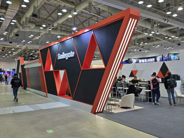 BTB관의 중앙 입구로 들어가면 가장 먼저 보이는 곳은 이번 BTB관 중 가장 큰 규모로 참여한 스마일게이트홀딩스 부스다. 회사의 CI에서 쓰고 있는 삼각형을 기반으로 벽과 내부를 꾸몄다.