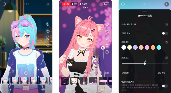 또한 'VTuber'는 자연스러운 3D 아바타 라이브 스트리밍을 진행할 수 있도록 다양한 옵션을 추가로 제공한다. 라이브 화면 내 아바타의 위치와 크기를 사용자가 직접 조정할 수 있고 아바타의 움직임 감도를 설정할 수 있으며 조명의 색상과 감도, 배경을 선택하여 콘텐츠에 어울리는 아바타의 모습을 연출할 수 있다. 아울러 사용자의 표정을 아바타에 실시간으로 적용하는 것 외에도 시청자와의 소통을 극대화하기 위해 Joy, Happy, Angry, Sorrow, Fun (기쁨, 행복, 화남, 슬픔, 즐거움) 등 강화된 감정 기능을 함께 활용할 수 있고 데스크, 마이크 등의 아이템과 다양한 배경 이미지를 추가로 선택할 수 있다.