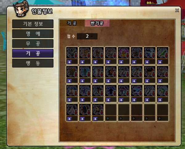 기공에서는 상대방의 기공 등급을 감소하는 반기공을 습득할 수 있다. 반기공은 총 27종으로, 상대방이 해당 기공을 가지고 있다면 그만큼 감소한 수치로 적용된다. 반기공을 초기화할 때는 장백자사나 장백자환을 사용하는데, 장백자사는 원하는 반기공 하나를, 장백자환은 반기공 전체를 초기화한다.