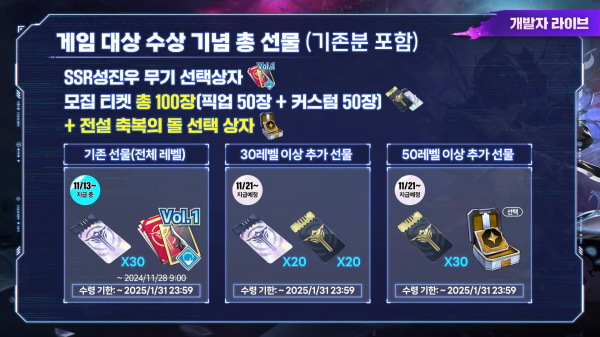 라이브 방송은 게임대상 수상 기념 선물로 기분 좋게 시작했다. SSR성진우 무기 선택상자, 모집 티켓 총 100장(픽업 50장, 커스텀 50장)을 제공한다. 여기에 전설 축복의 돌 선택 상자를 제공하는 등 1월 31일까지 접속하면 역대급 보상을 모두 수령할 수 있다.