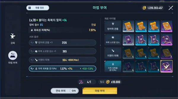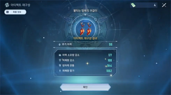 시뮬레이션 게이트 보상으로 마법부여에 사용되는 옵션 강화 재료를 받을 수 있다. 아티팩트를 추가 강화하는 기능으로 전투력이 향상된다. 재화로 골드를 사용하지만, 전체적으로 골드 보상량을 늘려 부족하지 않게 구성할 예정이다. 계속 도전하면 누구나 최대치까지 올라갈 수 있는 시스템이라 과금이나 확률에 기대지 않은 성장 시스템으로 설계했다.