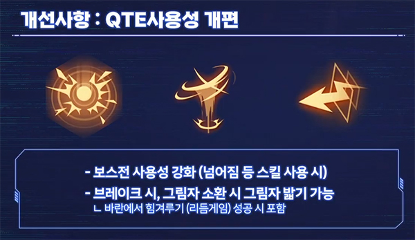 전투에서 스킬에 비해 사용빈도가 적었던 QTE의 사용빈도를 높이는 업데이트가 진행된다. 우선, 브레이크가 발동하거나 그림자를 소환했을 때 그림자 밟기가 가능해지도록 개편된다. 이를 통해 그림자 밟기를 다양한 상황에서 사용할 수 있다. 아울러 잔몹에서 자주 사용할 수 있었지만 보스전에서 사용하기 어려운 환경도 개선하여 사용성을 강화한다.