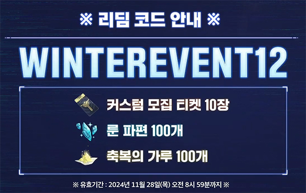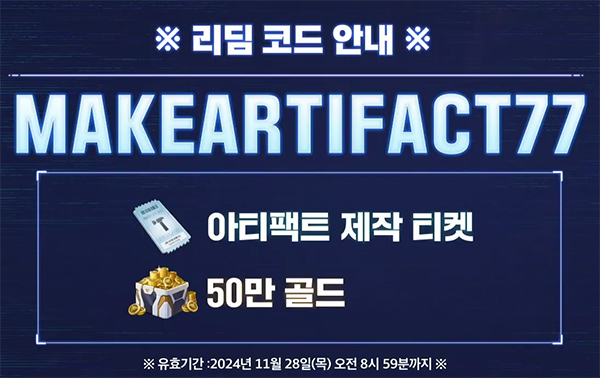 이번 라이브 방송에서는 2개의 리딤코드를 제공했다. 코드를 입력하면 아티팩트 제작 티켓, 50만 골드, 커스텀 모집 티켓 등을 제공한다. 코드는 다음과 같으며, 유효기간은 11월 28일 오전 8시 59분까지다. ▲WINTEREVENT12 ▲MAKEARTIFACT77