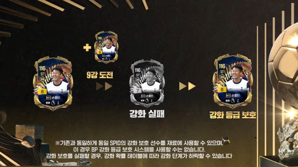 참고로 선수별 강화 등급 보호를 위한 비용은 해당 선수의 기준가의 100%보다 낮은 금액으로 설정될 예정이며, 오는 12월 5일 업데이트가 진행된다. 이를 통해 일부 신규 클래스를 제외한 전체 클래스를 대상으로 9강~13강 강화 도전 시 강화 등급 보호가 가능해진다.