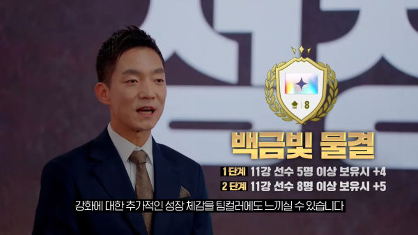 그리고 9, 10강 선수들의 희소성 유지를 위해 현재 8~10강 선수들의 강화 단계를 8~13강으로 세분화하는 작업을 진행한다. 이에 따라 9, 10강 선수들은 12월 5일 업데이트를 통해 각각 10, 12강으로 변경되며, 새로운 성장에 도전할 수 있도록 13강까지 강화 등급이 확장된다. 더불어 11~13강 선수들에게 적용 가능한 신규 강화 팀컬러 ‘백금빛 물결’이 추가된다.