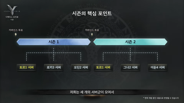또한, 시즌은 시작할 때마다 서버가 바뀐다. 3개의 서버가 매칭되어 한 시즌을 구성하는 인터 서버 개념을 가져와 다음 시즌에서는 새로운 서버와 매칭되어 시즌마다 새로운 서버를 만난다. 일반적인 MMORPG는 어느 정도 서비스가 진행되면 업데이트되는 크로스월드 개념을 처음부터 '이미르'에서 만날 수 있는 셈이다.