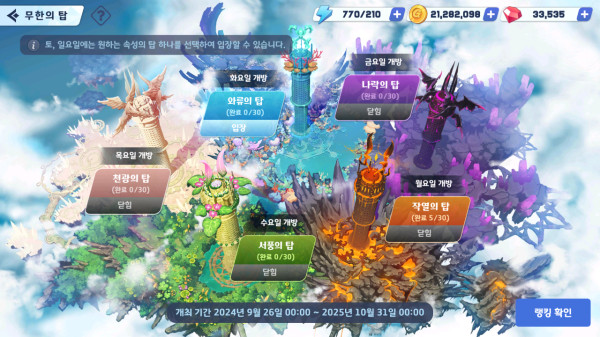 무한의 탑은 속성별 덱을 구성하여 높은 층을 계속해서 공략하는 도전형 콘텐츠다. 이용자는 요일별 오픈되는 불, 물, 자연, 어둠, 빛 등 총 5개의 탑에서 필수 속성의 캐릭터들을 육성하고 덱을 구성해 최고층에 오르기 위한 도전을 하게 된다. 새로운 덱으로 각 탑을 공략하여 매번 새로운 전략적 재미를 느낄 수 있다.