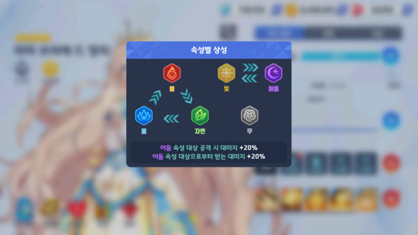 캐릭터는 불, 물, 자연, 무, 빛, 어둠 등 총 6가지 속성으로 나뉜다. 속성에 따라 상성이 존재하기 때문에, 상대에 따라 다양한 조합이 요구된다. 특히 같은 속성을 배치하면 버프 효과를 받을 수 있어 속성을 고려한 덱 구성 전략이 필요하다.