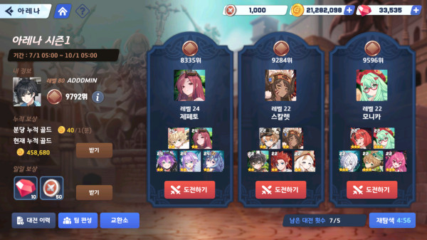 이 외에도 비동기식 PvP로 자신이 육성한 덱의 강함을 겨루는 아레나 콘텐츠가 있다. 성장 던전 콘텐츠인 보석 던전과 성장훈련소에서는 던전 클리어를 통해 다양한 성장 재화를 획득할 수 있다.