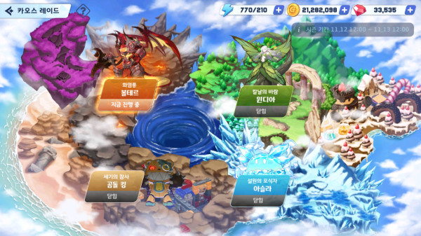 PVE 핵심 콘텐츠로 카오스 보스레이드가 존재한다. 카오스 보스레이드는 강력한 보스들과 전투하는 콘텐츠다. 최대 4개의 덱을 사용할 수 있기 때문에 난이도 높은 보스에 도전하기 위해서는 다양한 캐릭터의 육성이 필요하다.