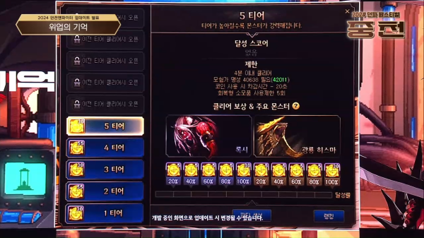 특수 던전 3종도 소개됐다. 위업의 기억은 월 단위로 진행되며, 모험가의 강함을 확인하도록 10단계로 설정됐다. 10단계를 클리어하면 모험 모드에 참여해 극한의 강함을 체감할 수 있다. 115제 장비 항아리가 보상으로 제공되어, 유니크부터 에픽까지 획득할 수 있다.