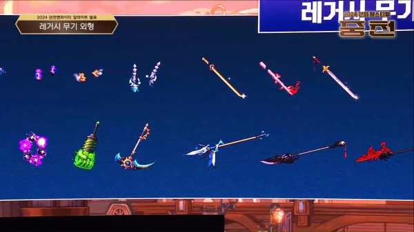 무기의 경우 무기 마스터리 시스템이 개편된다. 추억의 장비를 재해석한 레거시 무기는옵션만 보고 손쉽게 장착할 수 있다. 이번에 전 직업의 무기를 추가했고, 무기 자체에 독자적인 능력을 부여해 체감적으로 변화를 인지할 수 있다. 안개신 장비는 115레벨에서도 사용할 수 있도록 업그레이드된다. 업그레이드 정도는 에픽이나 태초급 무기 파밍 전까지 사용할 수 있는 스펙으로 상향된다.