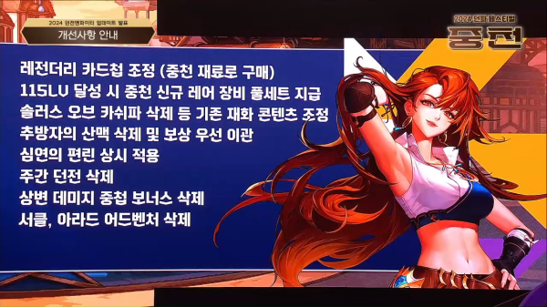 상당히 많은 부분이 개선 및 개편된다. 대표적으로 ▲안개신/깨어난 숲 보상 개선 ▲기존 상점(정가 아이템 제거) 개선 / 실드 상점 변경 ▲게이볼그 종료 및 중천 던전으로 이관 ▲구 던전 에픽 드랍 조정 ▲보조 특성 시스템 삭제 ▲무용담 상점 삭제 및 물품 이관 ▲룬/탈리스만 변경 ▲레전더리 카드첩 조정(중천 재료로 구매) ▲115레벨 달성 시 중천 신규 레어 장비 풀세트 지급 ▲솔러스 오브 카쉬파 삭제 등 기존 재화 콘텐츠 조정 ▲추방자의 산맥 삭제 및 보상 우선 이관 ▲심연의 편린 상시 적용 ▲주간 던전 삭제 ▲상변 데미지 중첩 보너스 삭제 ▲서클, 아라드 어드벤처 삭제 등이다.