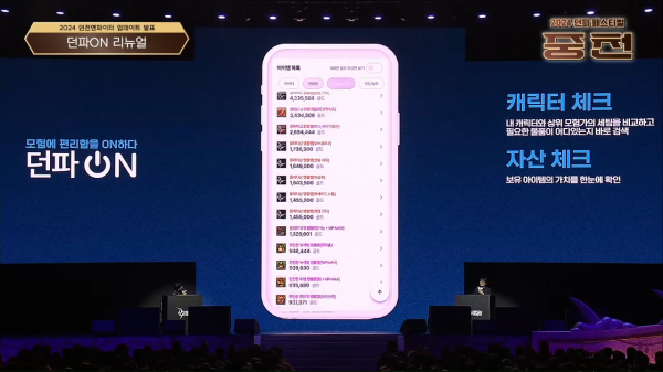 던파 ON 앱에는 계정체크 기능이 추가되어, 계정 정보를 한 눈에 볼 수 있다. 상위 모험가의 정보도 볼 수 있으며, 필요한 물품이 어디 있는지 바로 검색할 수 있다. 자산체크에서는 보유 아이템의 가치를 한 번에 확인할 수 있다. 경매장 입고ON은 원하는 아바타의 입고, 희망 구매 가격 알람 기능으로 매번 검색할 필요 없이 푸쉬 기능으로 유용하게 사용할 수 있다. 현재는 서버 부하로 아바타만 가능하지만, 향후 무기까지 범위를 넓힐 예정이며, 모든 기능은 오는 11월 28일 업데이트된다.
