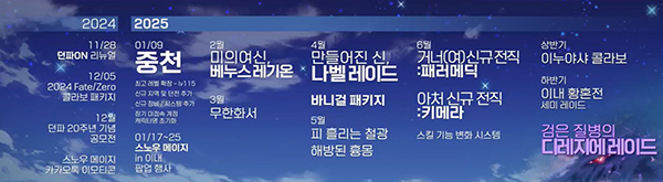 다가오는 2025년, 던파 20주년을 기념해 아바타와 무기 아바타 공모전을 진행한다. 또한, 인기 IP 이누야사와의 컬래버레이션이 2025년 상반기 중에 진행된다. 페이트 제로 컬래버레이션 복각도 다시 돌아온다. 중천 스폐셜 기프트로 스폐셜 레어 아바타를 모든 모험가들에게 증정한다.