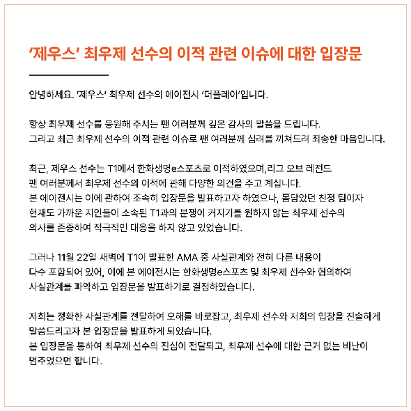 제우스 최우제의 한화생명 이적 논란은 11월 19일 첫날부터 시작됐다. T1의 제우스 작별 공지와 새로운 탑 라이너로 도란 최현준을 곧바로 영입했다는 소식이 이어지며 다양한 예측과 분석 등이 이어진 것이다. 특히, 확인되지 않은 루머들로 결국 T1은 대표의 질의응답 자리를 마련해 관련 사안에 대해 공식 입장을 밝혔다.