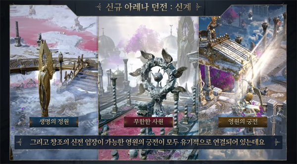 이와 더불어 신들의 에피소드가 시작되는 신규 아레나 던전, 신계가 지난 20일 '리니지W'에 업데이트 됐다. 아레나 던전 신계는 입구의 생명의 정원부터 무한한 사원, 영원의 궁전까지 모두 유기적으로 연결되어 있는 것이 특징이다.