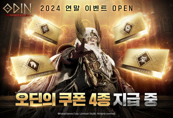 카카오게임즈는 연말을 기념해 오는 12월 25일까지 풍성한 보상을 제공하는 출석 이벤트를 진행한다. 게임에 접속하는 이용자 전원에게 ‘오딘의 아바타, 탈 것, 가호석, 룬‘ 4종의 쿠폰을 선물한다.