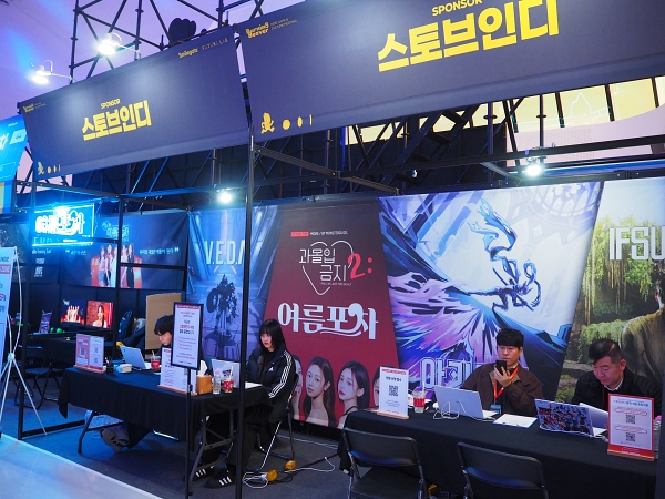 스토브인디 부스에서는 퍼블리싱 타이틀 ‘과몰입금지2’와 ‘V.E.D.A’를 만날 수 있다. ‘과몰입금지2’는 현실적인 스토리와 우수한 퀄리티로 5명의 미녀들과 연애를 즐기는 게임이다.