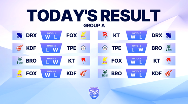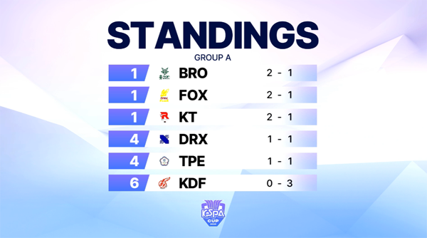 그 결과 브리온과 피어엑스, KT는 모두 첫날 2승 1패를 기록하며 공동 1위에 올랐다. DRX와 대만 올스타는 1승 1패로 중위권을, 광동은 3패만을 기록해 최하위로 밀려나면서 험난한 여정을 예고했다.