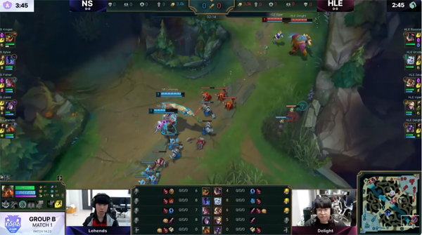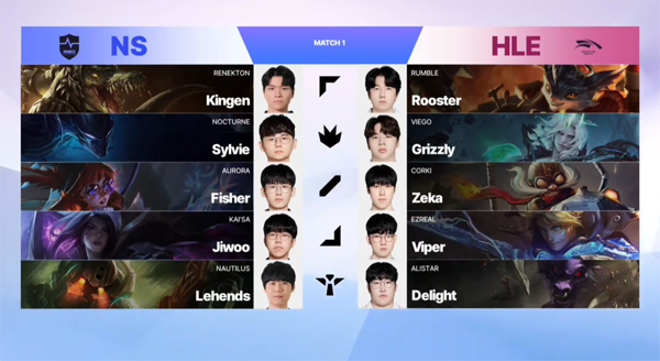 밴픽 단계에서는 정석적인 챔피언들이 선택됐다. 농심은 미드 오로라와 원딜 키이사 중심의 구성을, 한화 생명은 탑 럼블과 원딜 이즈리얼 등을 선택에 대응에 나섰다. 퍼스트 킬은 한화생명 바이퍼의 이즈리얼이 가져가면서 주도권을 확보했다.