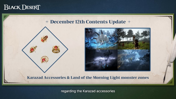 따라서 앞서 언급된 콘텐츠는 차세대 버전이 출시될 때까지 업데이트가 지연되어야 하며, 기다려온 새로운 콘텐츠를 원하는 만큼 빨리 제공하는 데 한계가 있다고 밝혔다. 그래서 몇 가지 업데이트와 콘솔 전용 기능을 통해 유저들을 달랠 예정이다. 여기에는 카라자드 액세서리와 아침의 나라 사냥터가 포함되며, 오는 12일에 출시된다.