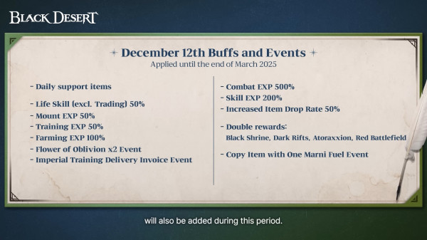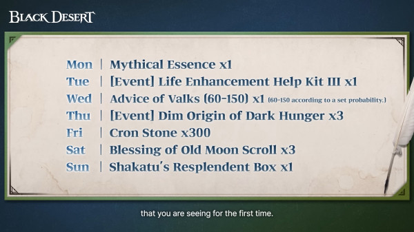 업데이트 전에 이 부분을 대응하기 위해 매일 로그인만 하면 다양하고 유용한 아이템들을 받을 수 있게 된다. 아이템 중에는 처음 추가되는 '신화의 정수'가 있는데, 네 개를 모아서 합치면 신화의 향로를 얻을 수 있다. 그 외에 여러 아이템들과 주말에 적용되는 다양한 버프 및 이벤트는 내년 3월까지 이어질 예정이며, 이 이벤트 역시 12일부터 시작된다.