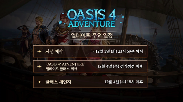 ‘오아시스 4: 어드벤처’ 업데이트 사전 예약은 오는 12월 3일까지 진행된다. 이어 4일 정기 점검과 함께 ‘오아이스 4: 어드벤처’ 업데이트 클래스 케어가 진행되고, 4일 18시 이후부터 클래스 체인지가 가능하다.