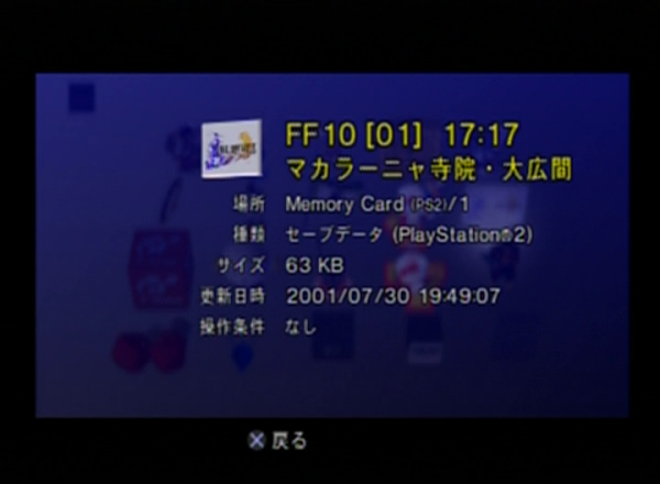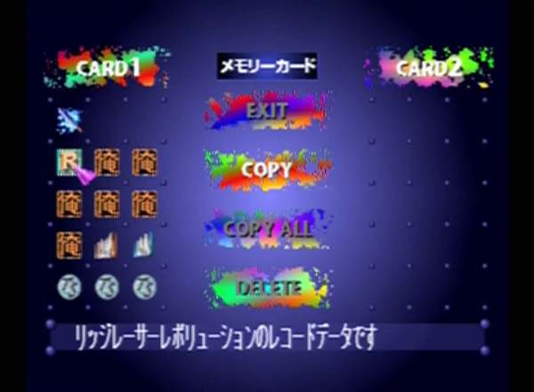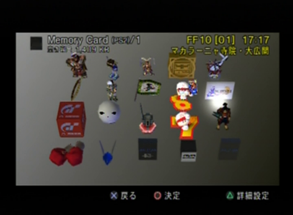 초창기 PS의 메인 메뉴는 '메모리 카드'와 'CD 플레이어' 두 가지 항목만 있는 심플한 메뉴로 구성됐다. 전자를 선택하면 메모리 카드에 기록된 각 게임의 세이브 데이터가 표시되며, 이를 삭제하거나 다른 메모리 카드에 복사할 수 있다.