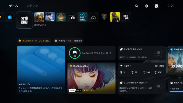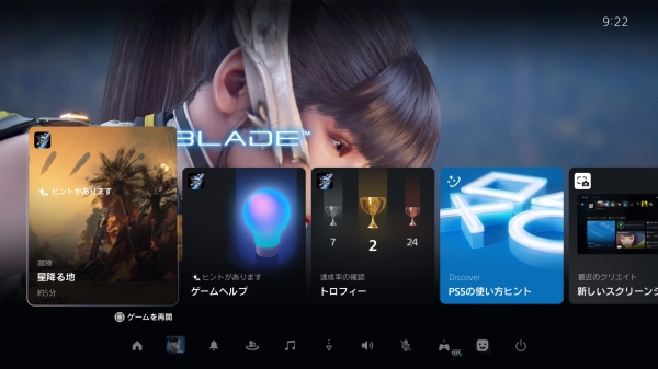2020년 11월 12일에 발매된 PS5의 홈 화면은 기본적으로 PS4의 홈 화면을 따르고 있다. 컨트롤러의 PS 버튼으로 호출할 수 있는 컨트롤 센터에서는 각종 '카드'로 게임 정보나 힌트 등을 확인할 수 있으며, 화면 하단의 아이콘으로 앱 전환이나 알림 확인 등을 할 수 있다. 컨트롤 센터는 게임을 플레이하는 도중에도 호출할 수 있으며, 각종 정보나 기능에 대한 액세스가 가능하다.