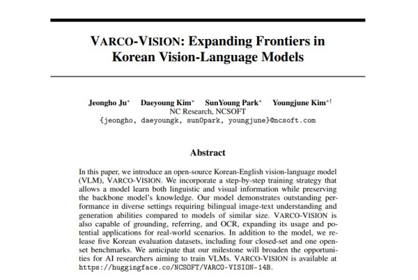 엔씨소프트(공동대표 김택진, 박병무 이하 엔씨(NC))가 뛰어난 한국어 성능을 자랑하는 중소형 오픈소스 VLM(Vision Language Model) 모델 ‘VARCO-VISION’과 한국어 멀티모달 벤치마크 5종을 4일 공개했다.