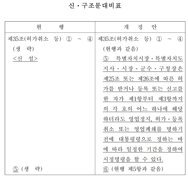 이에 현 제35조제5항을 제6항으로 하고, 제35조제5항을 신설해 특별자치시장-특별자치도지사 등의 행정 처분 이전에 관련 사업자에게 대통령령으로 정하는 바에 따라 일정한 기간 뒤에 시정명령을 할 수 있는 근거 규정을 마련한다는 것이 민형배 의원실의 입장이다.