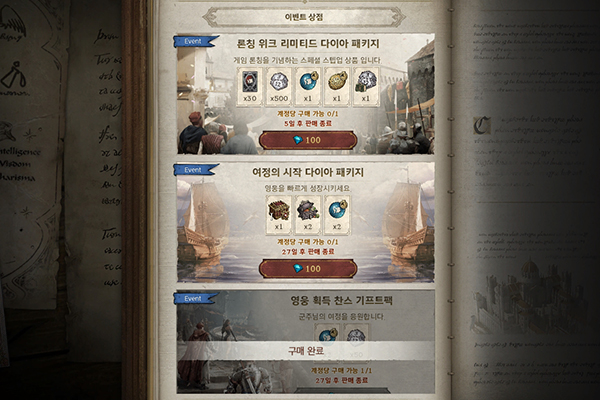 나머지 상품인 ▲여정의 시작 다이아 패키지 ▲론칭 위크 리미티드 다이아 패키지도 각각 100 다이아로 구매할 수 있으므로 재화에 여유가 있으면 챙겨놓자. 모두 런칭 기념 이벤트 패키지므로 부담 없이 구매할 수 있다.