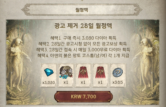 '저니 오브 모나크'는 런칭과 함께 다양한 패키지 상품을 출시했다. 그중 무소과금 유저에게 가장 유용한 패키지는 '광고 제거 28일 월정액' 상품이다. 해당 상품은 ▲다이아 3,080개 ▲28일간 광고 시청없이 광고보상 획득 ▲28일간 접속 시 매일 3천 무료 다이아 ▲아덴의 붉은 망토 코스튬(남/녀) 각 1개 등을 지급하는 등 알짜배기 보상으로 구성됐다.