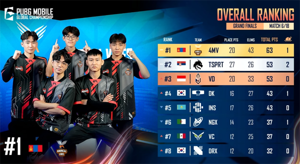 특히, 몽골 지역 팀인 포메리컬 바이브스(4MV)는 남다른 저력을 발휘하면서 당당히 그랜드 파이널 1일차 종합 1위를 기록했다. 매치 4에서는 킬 중심의 운영을 펼친 동시에 자기장 경쟁에서도 이득을 챙기면서 23킬 치킨을 가져가 한 매치만에 33점을 확보했다.