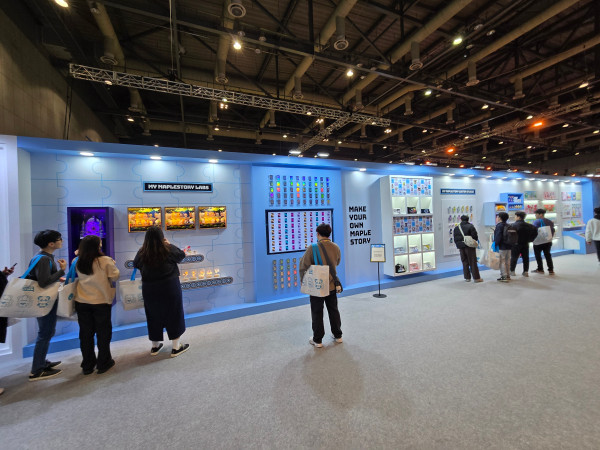 ‘메이플스토어’의 신규 서비스인 ‘마이 메이플스토리(My MapleStory)’도 현장에 선보였다. 이 부스에서는 넥슨에센셜 메이플스토어 내 론칭하는 ‘커스텀 스튜디오’와 ‘랩스’ 등 2가지 서비스를 먼저 체험할 수 있다. ‘커스텀 스튜디오’는 ‘메이플스토리’ 캐릭터나 몬스터를 활용해 나만의 티셔츠와 굿즈 제작을 할 수 있는 프로그램이다.