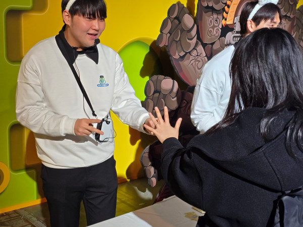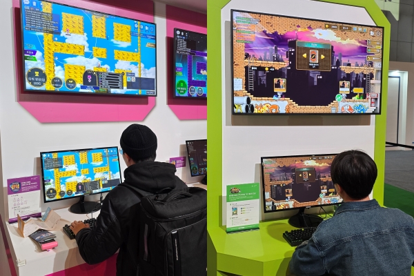 블록코딩 플랫폼인 ‘헬로메이플’ 부스다. 부스에서는 ‘헬로메이플’ 관련 영상 3종을 시청할 수 있으며, 블록 형태를 활용한 포토존과 휴게존을 마련해 사진을 촬영하거나 전시 자료를 자유롭게 즐길 수 있다.